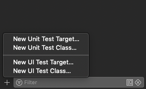 Navigator View에서 6번째 탭을 선택하면 아래와 같은 화면이 나오는데, 좌측 하단에 +버튼을 누르고 New Unit Test Target을 눌러서 타겟을 생성하면 된다.